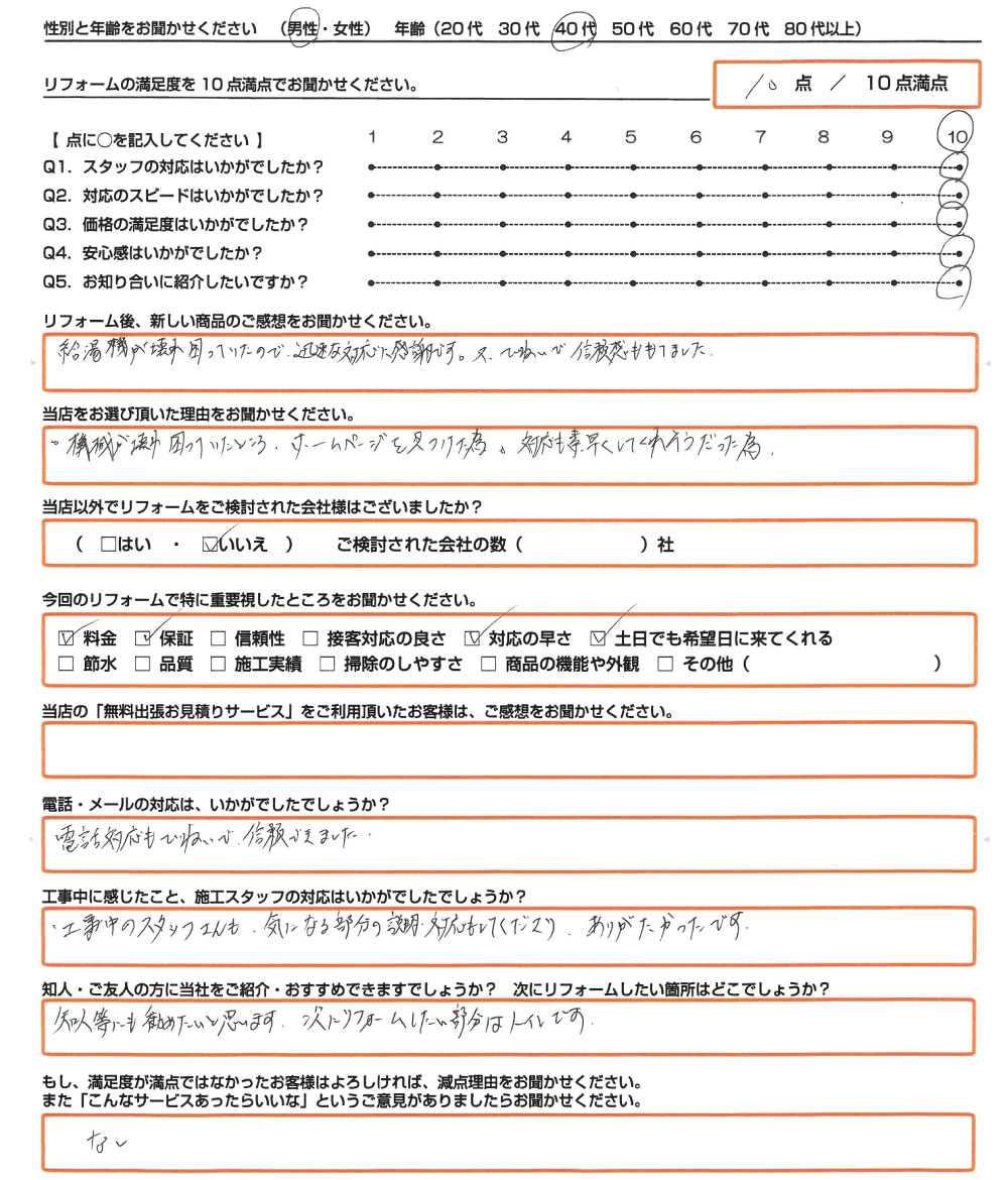 奈良市 エコキュート取替のお客様のご感想 2025年11月6日 最終更新日時 : 2025年9月8日 2025年11月06日【アンケートの内容】Q. リフォーム後、新しい商品のご感想をお聞かせください。 給湯器が壊れ困っていたので、迅速な対応に感謝です。又、ていねいで信頼感ももてました。 Q. 当店を選ばれた理由をお聞かせください。 機械が壊れ困っていたところ、ホームページを見つけた為。対応も素早くしてくれそうだった為。 Q. 当店以外でリフォームを検討された会社様はございましたか? いいえ Q. 今回のリフォームで特に重要視したところをお聞かせください 料金・保証・対応の早さ・土日でも希望日に来てくれる Q. 当店の「無料出張お見積りサービス」をご利用頂いたお客様は、ご感想をお聞かせください ― Q. 電話・メールの対応は、いかがでしたでしょうか? 電話対応もていねいで、信頼できました。 Q. 工事中に感じたこと、施工スタッフの対応はいかがでしたでしょうか? 工事中のスタッフさんも、気になる部分の説明、対応もしてくださり、ありがたかったです。 Q. 知人・ご友人の方に当社をご紹介・おすすめできますでしょうか?次にリフォームしたい箇所はどこでしょうか? 知人等に勧めたいと思います。 次にリフォームしたい部分はトイレです。 Q. もし、満足度が満点ではなかったお客様はよろしければ、減点理由をお聞かせください。また「こんなサービスあったらいいな」というご意見がありましたらお聞かせください。 なし