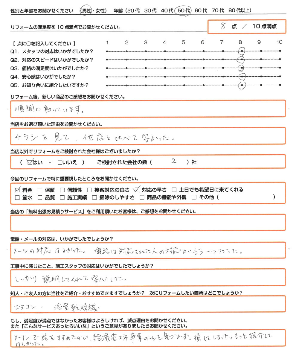 奈良市 エコキュート取替のお客様のご感想 2025年9月17日 最終更新日時 : 2025年9月8日 2025年09月17日【アンケートの内容】Q. リフォーム後、新しい商品のご感想をお聞かせください。 順調に動いております。 Q. 当店を選ばれた理由をお聞かせください。 チラシを見て、他店と比べて安かった。 Q. 当店以外でリフォームを検討された会社様はございましたか? はい 【ご検討された会社の数】 2社 Q. 今回のリフォームで特に重要視したところをお聞かせください 料金・対応の早さ Q. 当店の「無料出張お見積りサービス」をご利用頂いたお客様は、ご感想をお聞かせください ― Q. 電話・メールの対応は、いかがでしたでしょうか? メールの対応はよかった。電話は対応された人の対応がもう一つだった。 Q. 工事中に感じたこと、施工スタッフの対応はいかがでしたでしょうか? しっかり説明してくれて安心した。 Q. 知人・ご友人の方に当社をご紹介・おすすめできますでしょうか?次にリフォームしたい箇所はどこでしょうか? エアコン、浴室乾燥機 Q. もし、満足度が満点ではなかったお客様はよろしければ、減点理由をお聞かせください。また「こんなサービスあったらいいな」というご意見がありましたらお聞かせください。
