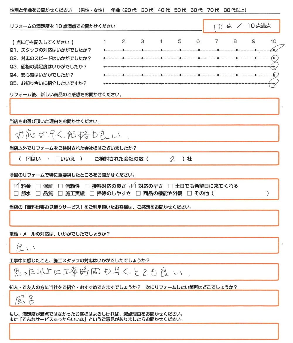 橿原市 エコキュート取替のお客様のご感想 2025年9月30日 最終更新日時 : 2025年9月8日 2025年09月30日【アンケートの内容】Q. リフォーム後、新しい商品のご感想をお聞かせください。 ― Q. 当店を選ばれた理由をお聞かせください。 対応が早く価格も良い Q. 当店以外でリフォームを検討された会社様はございましたか? はい 【ご検討された会社の数】 2社 Q. 今回のリフォームで特に重要視したところをお聞かせください 料金・対応の早さ Q. 当店の「無料出張お見積りサービス」をご利用頂いたお客様は、ご感想をお聞かせください ― Q. 電話・メールの対応は、いかがでしたでしょうか? 良い Q. 工事中に感じたこと、施工スタッフの対応はいかがでしたでしょうか? 思った以上に工事時間も早くとても良い Q. 知人・ご友人の方に当社をご紹介・おすすめできますでしょうか?次にリフォームしたい箇所はどこでしょうか? 風呂 Q. もし、満足度が満点ではなかったお客様はよろしければ、減点理由をお聞かせください。また「こんなサービスあったらいいな」というご意見がありましたらお聞かせください。 ―